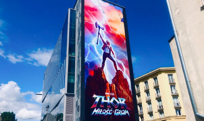 Ein gigantisches, über eine ganze Häuserflanke reichendes Werbeplakat sticht ins Auge; die aufkommende Abenddämmerung fügt dem dominierenden Blau des abgebildeten Filmhelden Thor eine Farbdimension hinzu, die nur im Einklang mit der gegebenen Zeit magisch in Bann zu ziehen vermag.